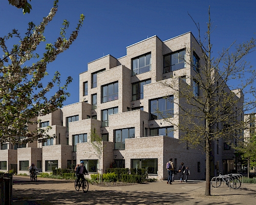 This exemplar development combines the very best in design and environmental sustainability, achieving Code for Sustainable Homes Level 5. Within the broader masterplan for Clay Farm, the scheme created 208 new homes arranged in a grid of quads surrounding a new park at the heart of the site.
