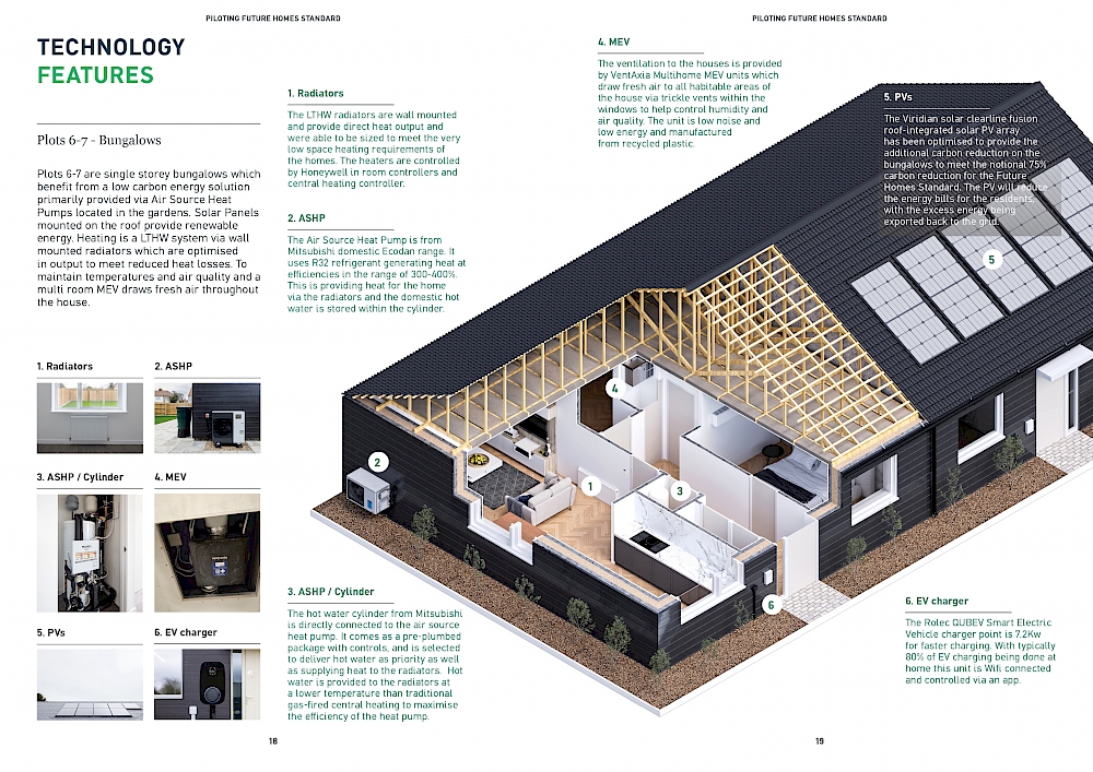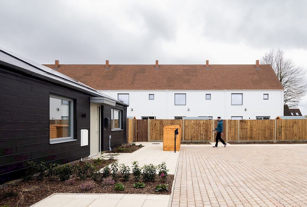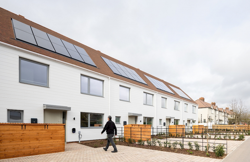 The Peasecroft development provides seven new homes for affordable rent. The development sees the construction of five 3-bedroom terraced houses and two 2-bedroom semi-detached bungalows. The houses have been designed with a fabric first approach with direct electric solutions (electric heaters and infrared panels) and the bungalows have adopted a technology led approach with air source heat pumps. The homes on Peasecroft are zero carbon when modelled in the new Home Energy Model. The ventilation systems used are more efficient than the FHS notional specification, with the MVHR in the houses providing significant benefits in retaining heat and comfort levels. The project has demonstrated a cost-effective, scalable approach to delivering sustainable energy homes.