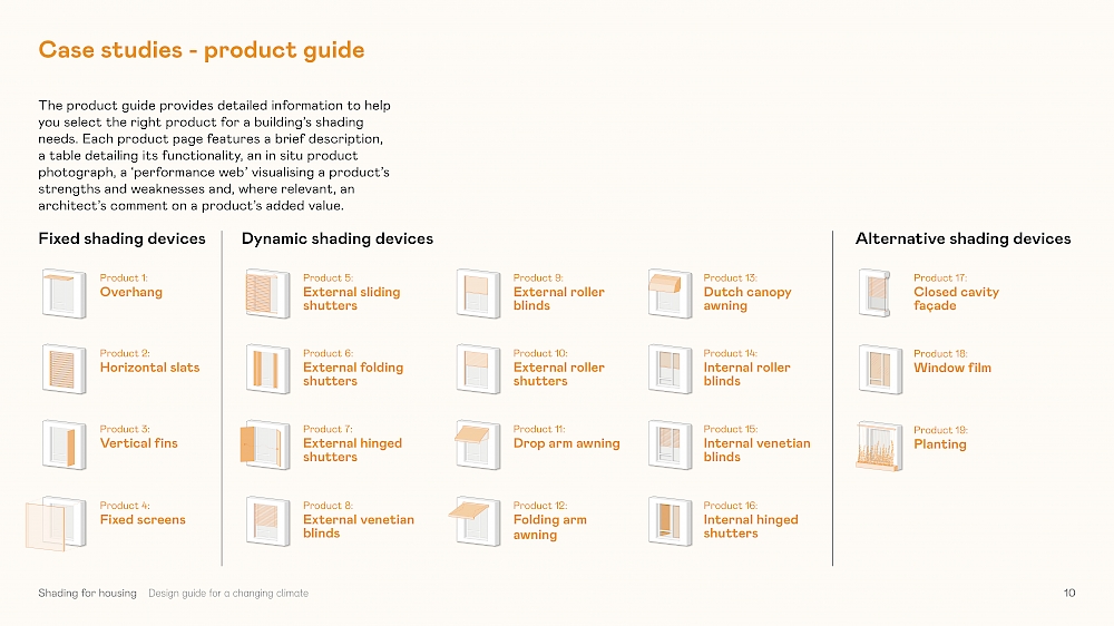 A product section provides detailed information to help users to select the right product for a building’s shading needs. Each product page features a brief description, a table detailing its functionality, an in-situ product photograph, a ‘performance web’ visualising a product’s strengths and weaknesses and, where relevant, an architect’s comment on a product’s added value.