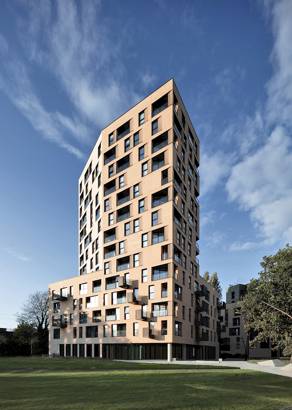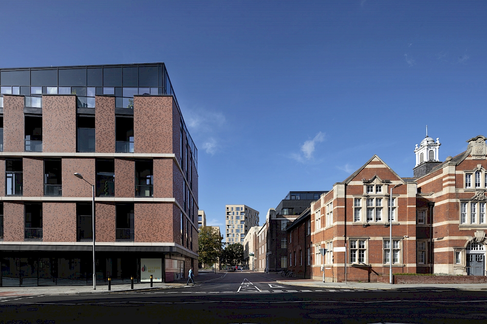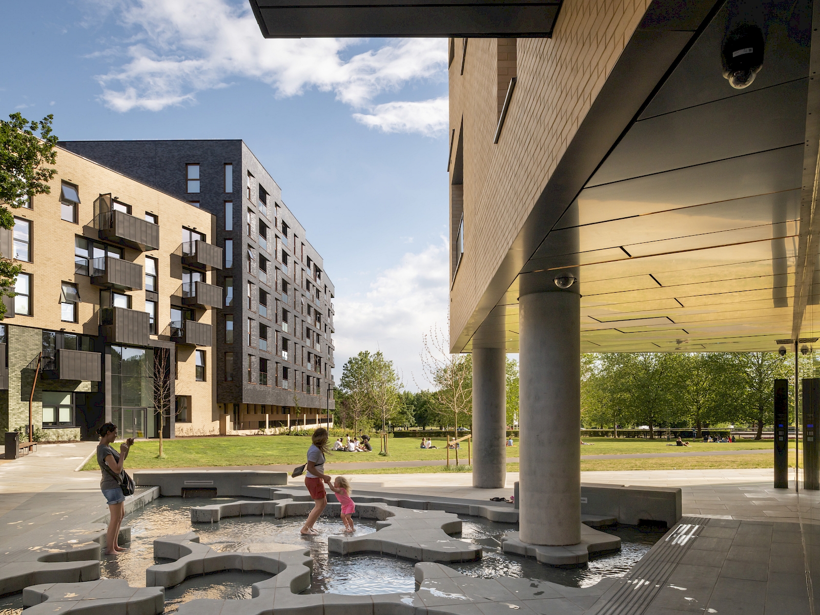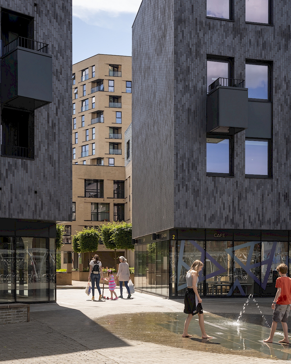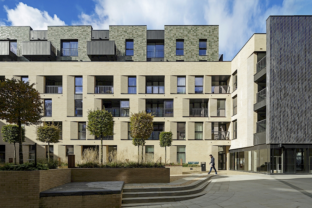City Park West is a new residential quarter in Chelmsford comprising more than 600 homes alongside cafés, restaurants, landscaped public realm, sculpture, workplaces and community facilities. The new townscape, built over two phases, connects parkland to the south with the civic quarter and the historic market town centre to the east. Located by the railway station on the former Anglia Ruskin University campus, it features five new brick buildings, including a 14-storey tower, four new public squares and three refurbished buildings, one of which is listed.