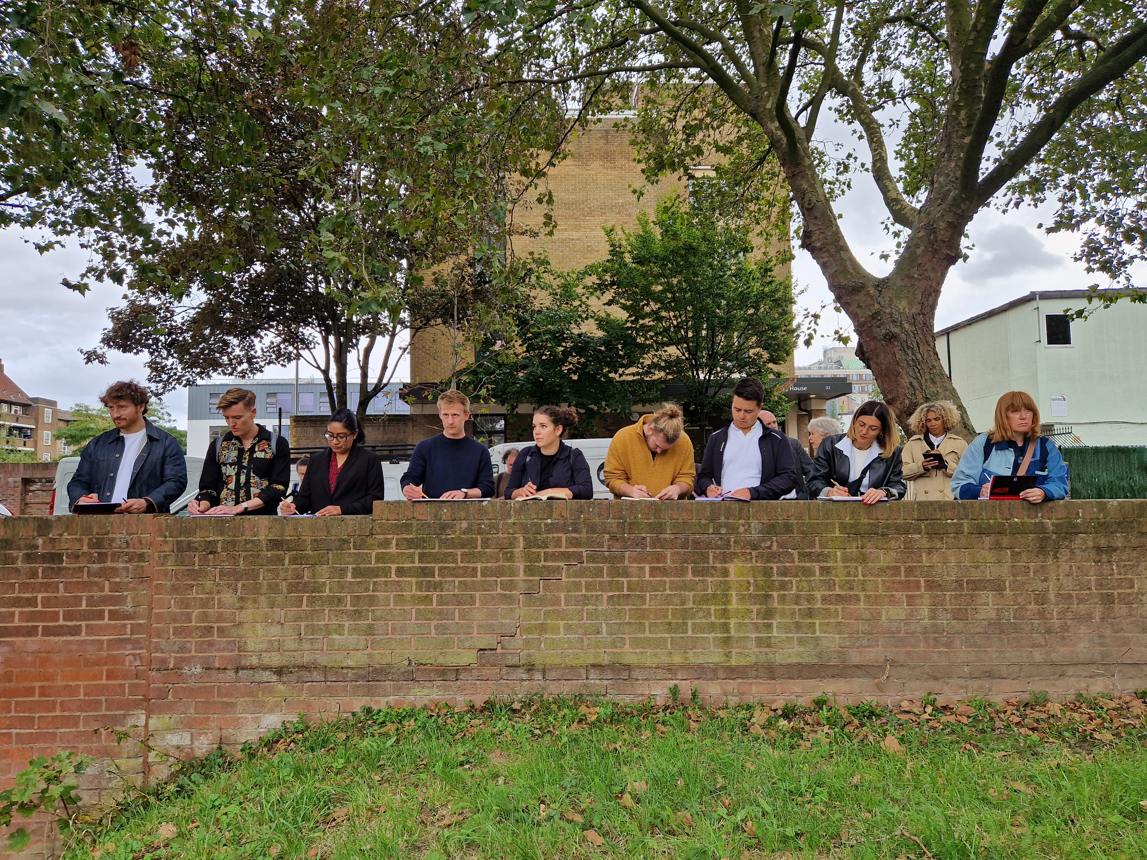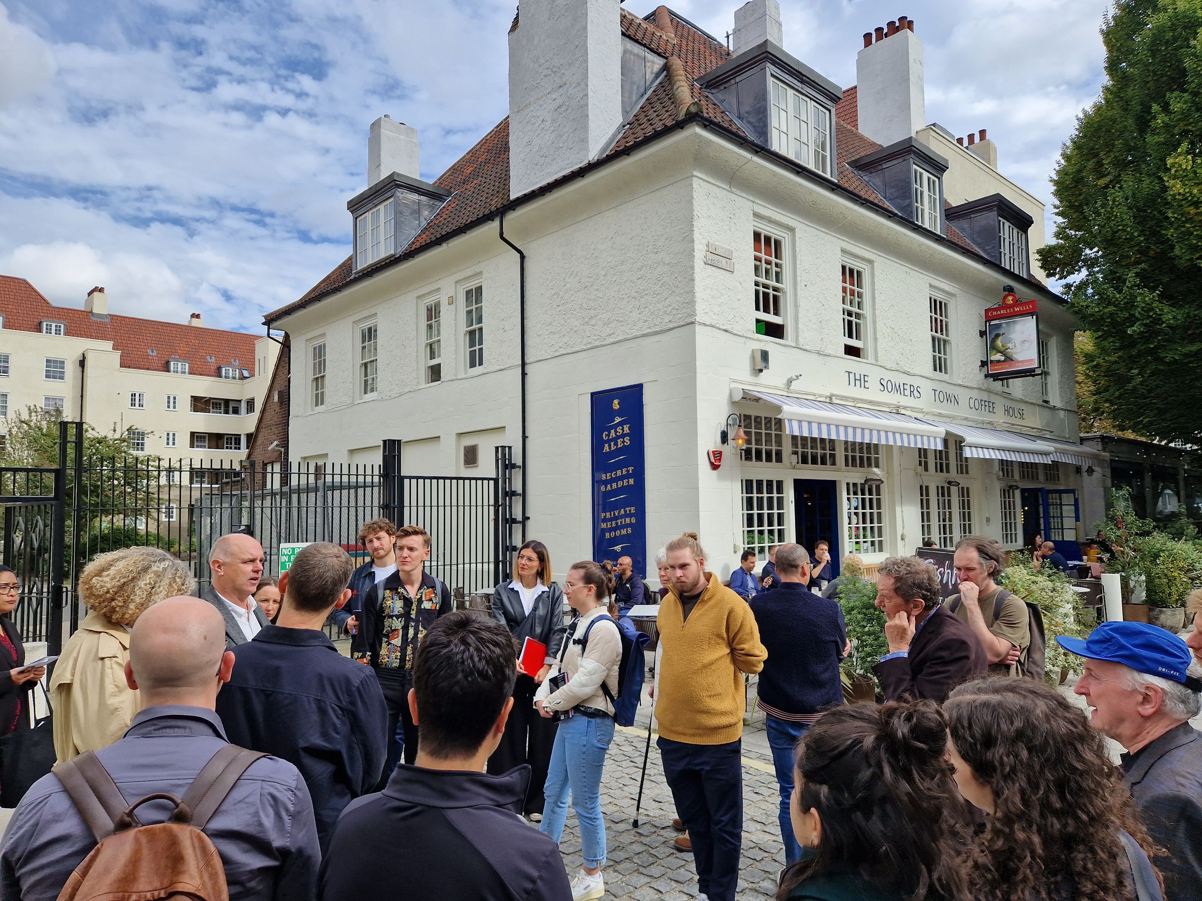 The tour kicked off in Churchway, extensively rebuilt by the LCC in 1899 to ease overcrowding. As the cohort began drawing, Patrick unpacked the history of ‘social housing’ in Somers Town: how it first emerged in the 1840s and how, by the time the six-storey, steel-frame, deck access complex called Ossulston Estate (1926-1937) – our next sketching stop - was built, housing for low income people was an established driver of architectural style and building innovation.