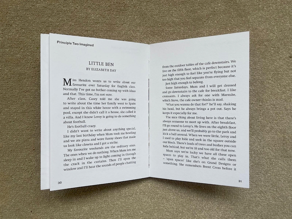 Related Argent would hard agree. In 2018, long before the first buildings at Brent Cross Town began to take shape, it commissioned a book of five short stories from established writers Elizabeth Day, Will Wiles, Guy Gunaratne as well as poet Kayo Chingonyi and artist Marie Jacotey, to imagine – dream - what it would be like to live in Brent Cross Town. Micro-stories, just 600 words long. This is an excerpt from Little Ben by Elizabeth Day: