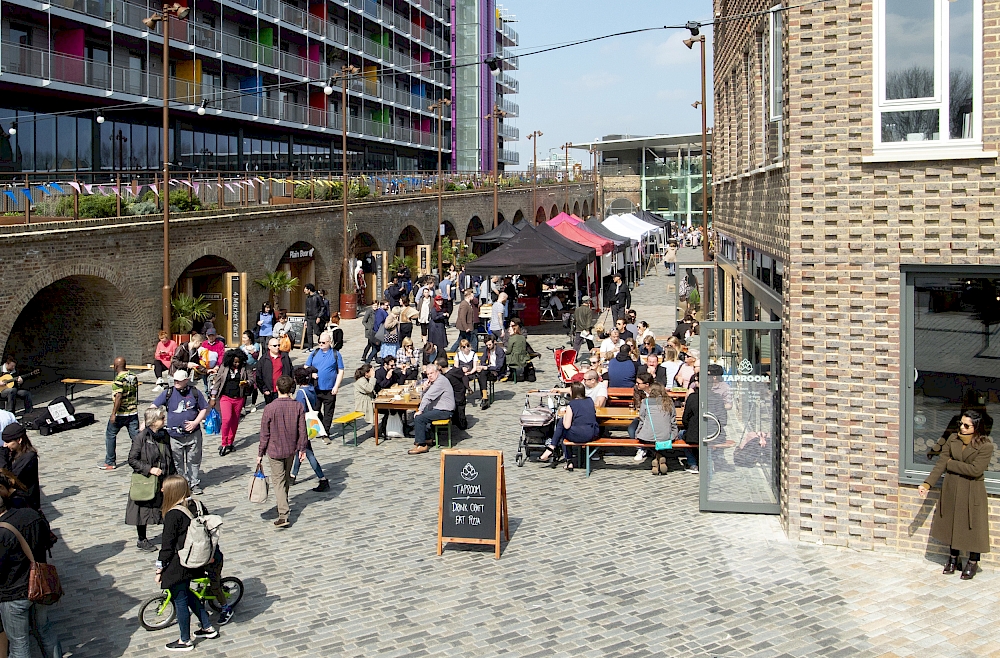 Pollard Thomas Edwards’ contribution to Deptford town centre’s regeneration continues with the restoration of the Grade II listed railway carriage ramp and landscaped public spaces outside the new railway station. The sensitive restoration of the Victorian carriage ramp incorporates 14 commercial spaces within the arches, the home of local creative businesses that spill out onto a new market court.