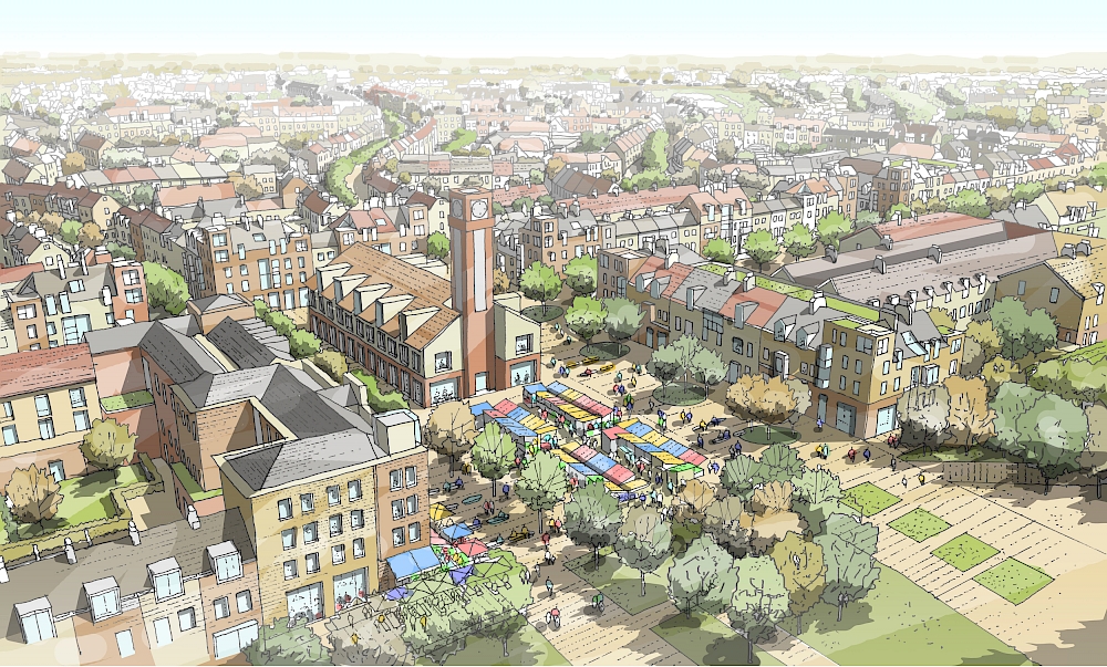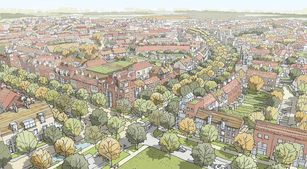 This 600-acre Second World War aerodrome will be transformed into a new Surrey village for the 21st Century, with 1,800 homes set within a 350-acre country park and focused on a market square with shops and schools. The former runway becomes a landscape feature integrating the village with the expanded business park.