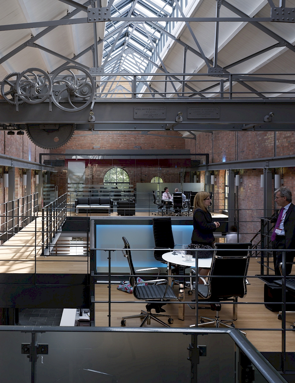 Hill’s spectacular headquarters were crafted from two derelict historic buildings and a new glazed office wing, in a sensitive landscape setting of water meadows. The Power House and Water Tower were formerly part of the Royal Gunpowder Mills.