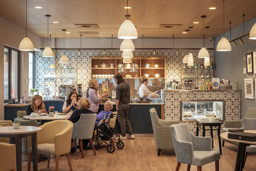 The new scheme delivers 116 resident rooms along with social spaces for gatherings, an activity kitchen, café, therapy rooms and quiet areas for the residents.
