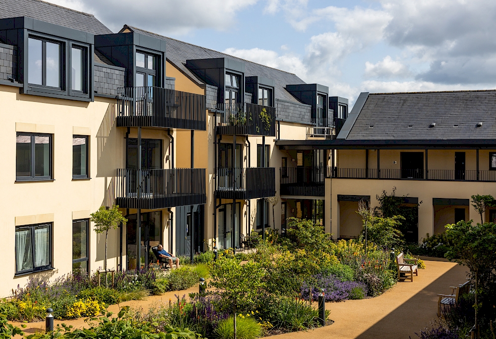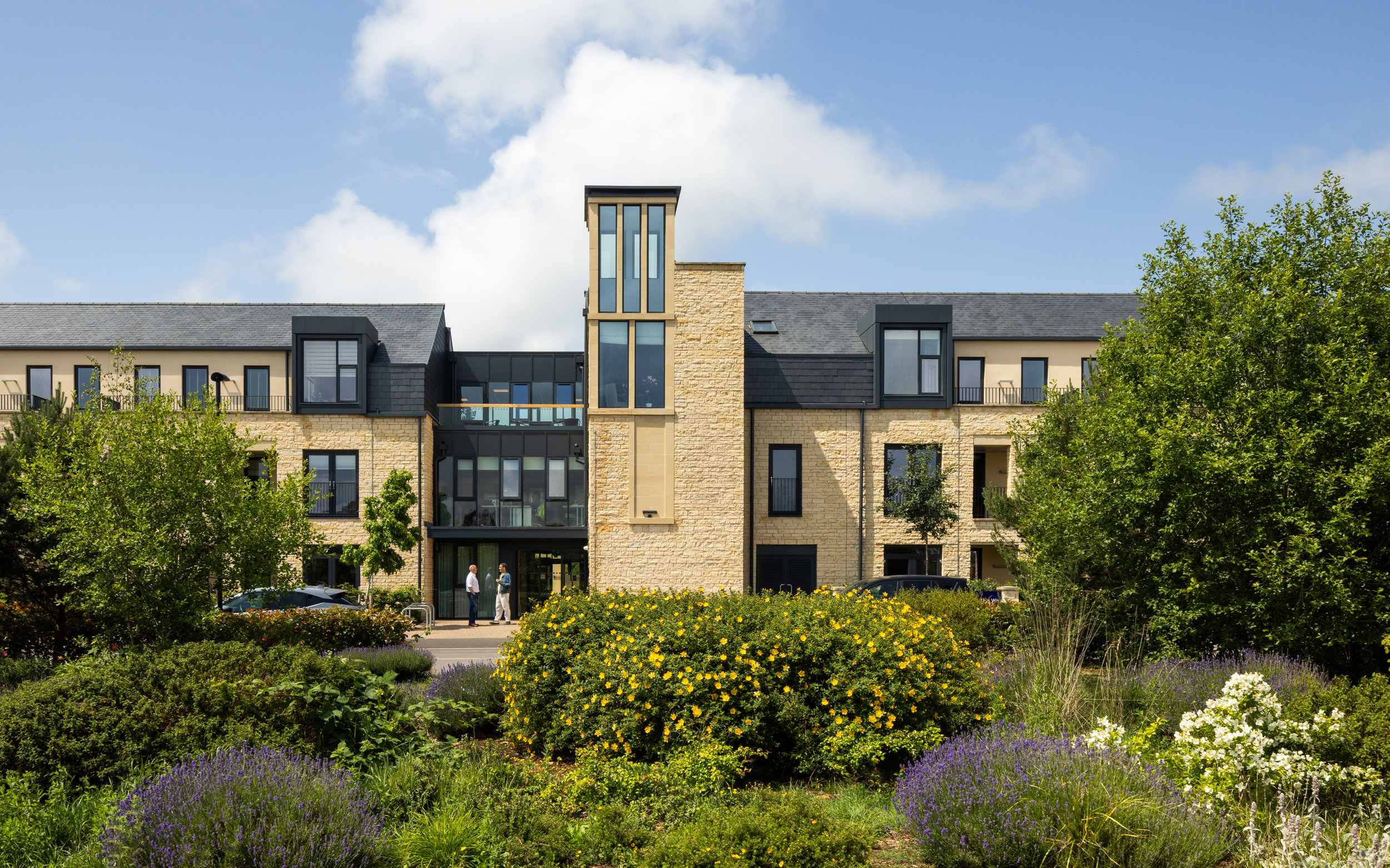 Glazed communal spaces form vertical breaks, bringing light and ventilation into the internal corridors and providing additional relaxed communal spaces for residents and staff. The glazed links are set back from the building face to emphasise separation and define villa forms. A rubble stone wrapping and the roof design provide a further articulation, making connections in scale and proportion to the houses planned for the wider site.
