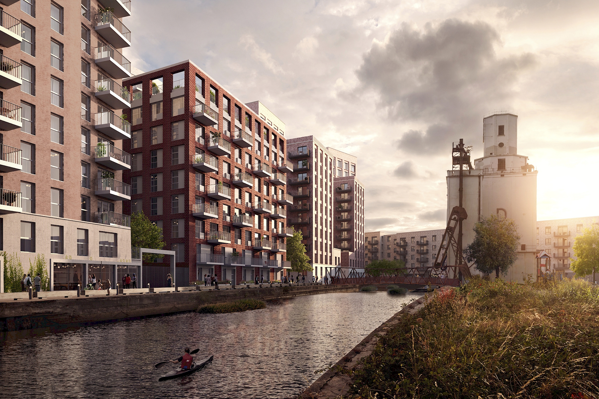 The design for each residential block and its individual façades responds to a place in the masterplan, creating visual anchors and active frontages. The materials used, including rich red brick with matching mortar, textured concrete and perforated metal, convey a contemporary interpretation of the architecture of dockside warehouses.
