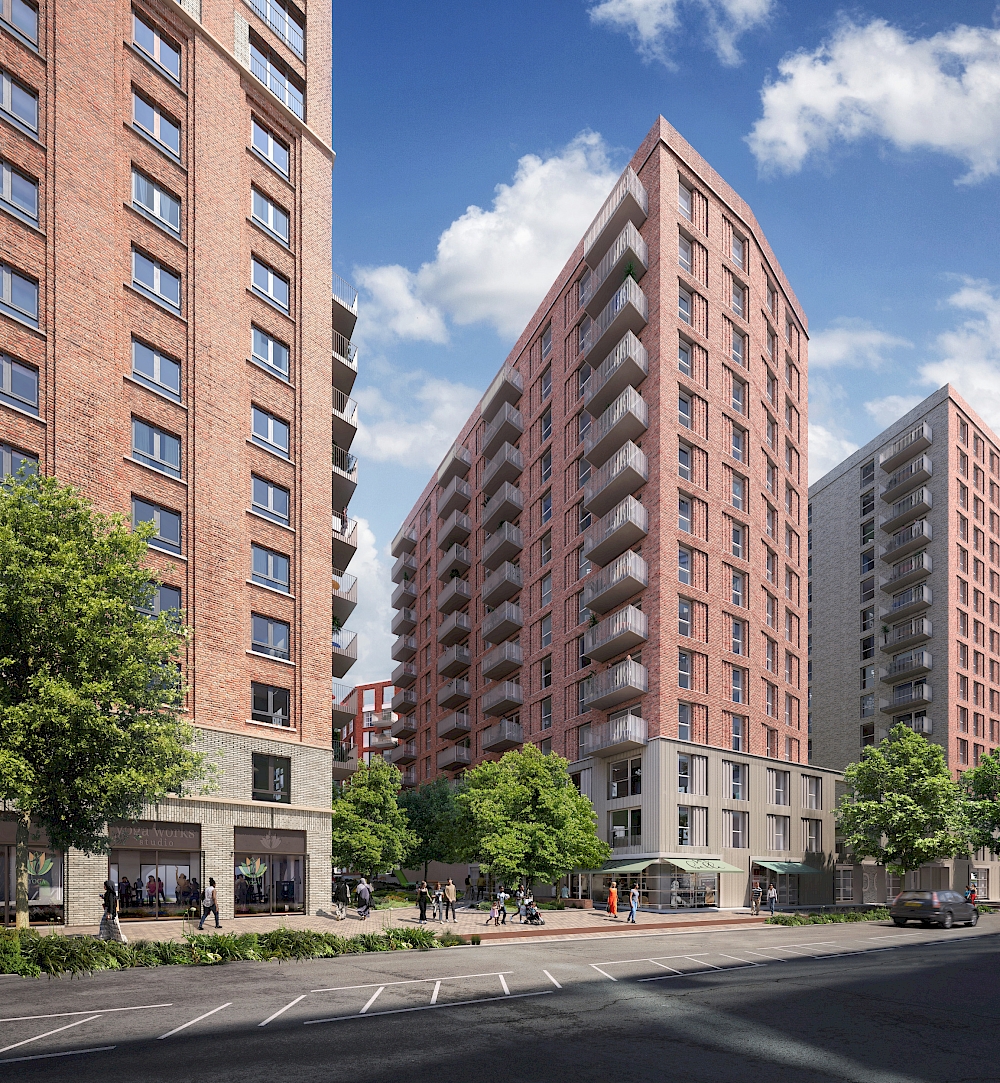 Plots 5 and 8 designed by PTE feature one-, two- and three-bedroom flats in a mixture of tenures, and 8 affordable family maisonettes with private gardens. 125 of the new homes will be affordable.