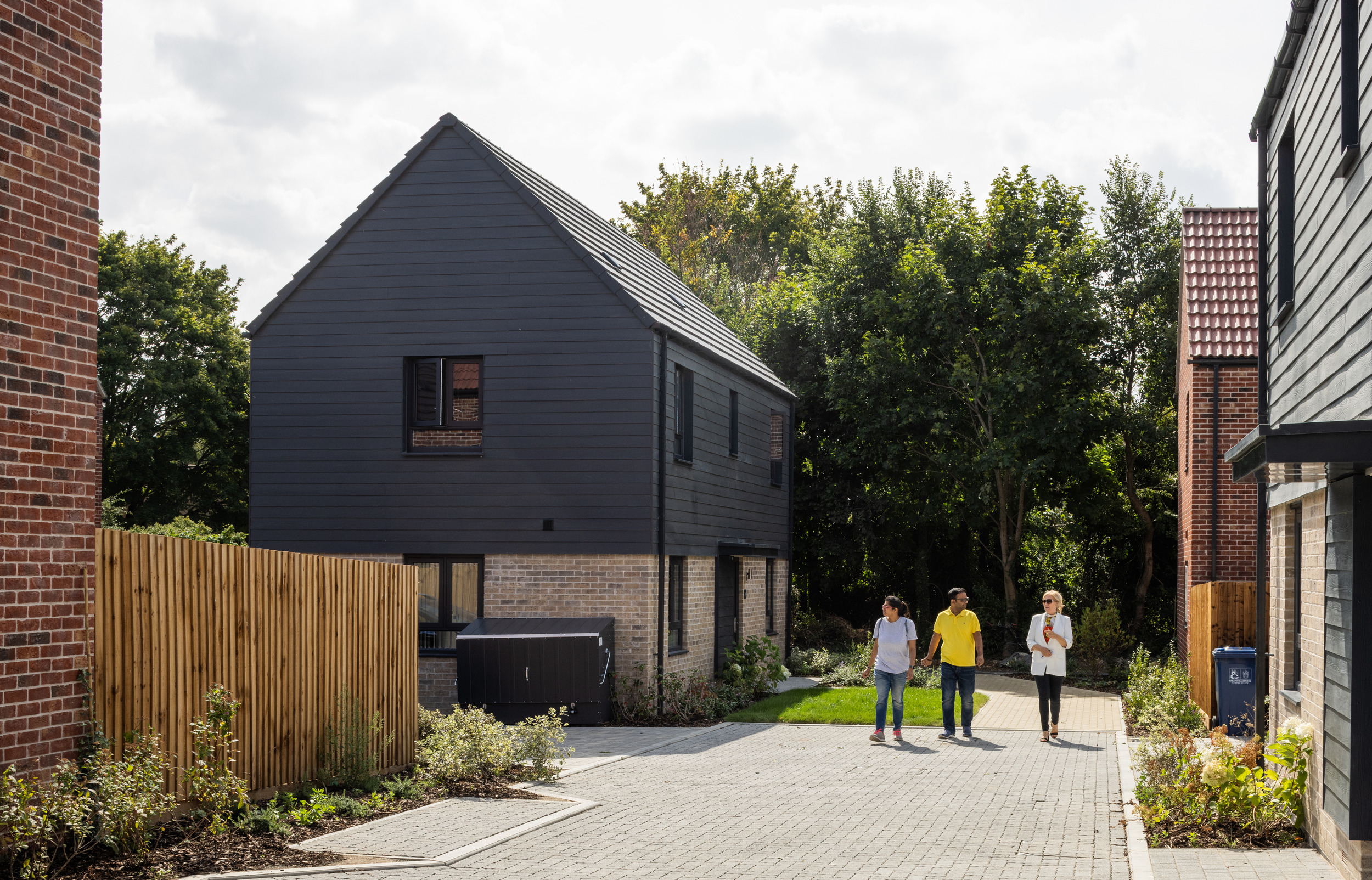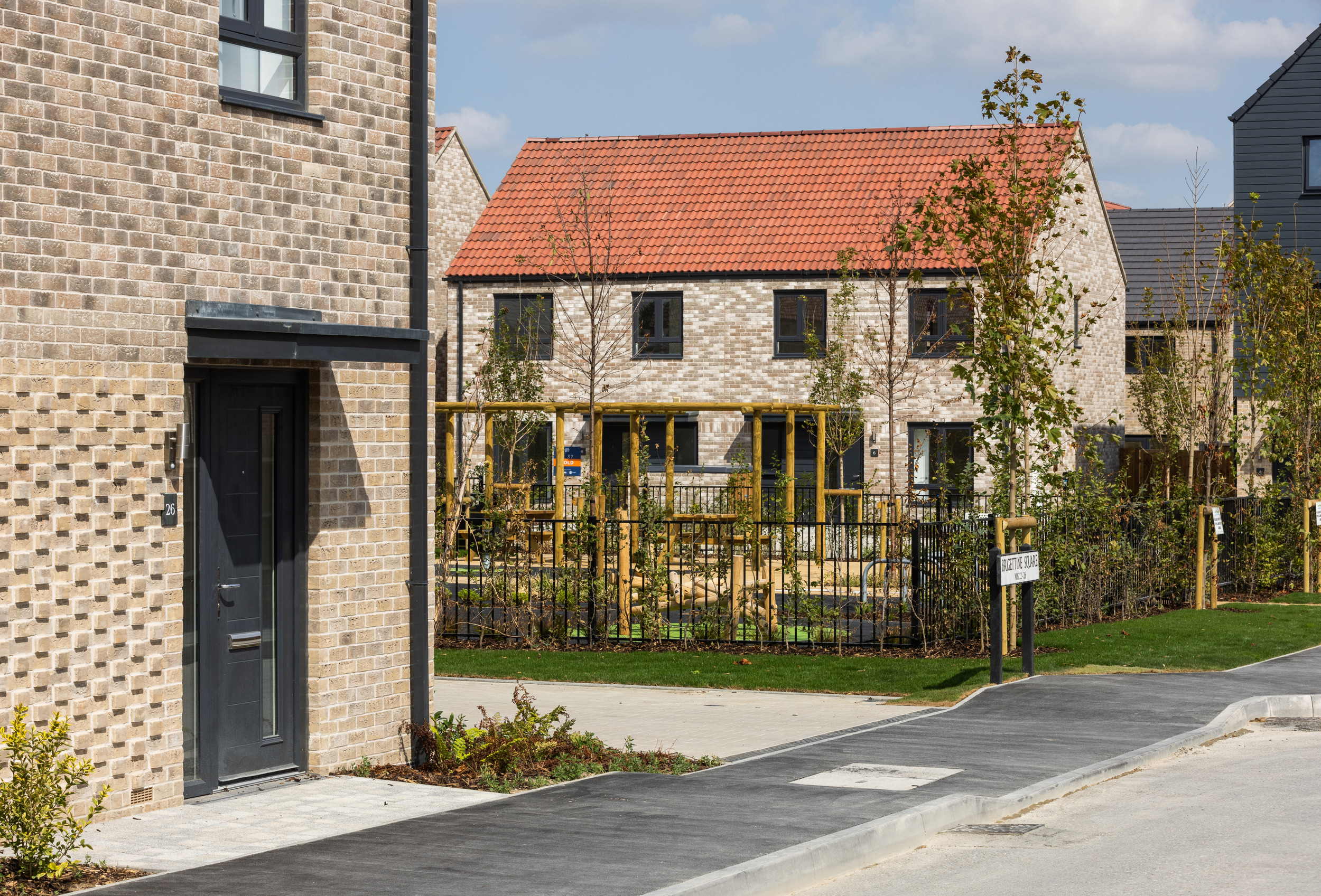Taking inspiration from farm, barn and cottage typologies the character areas vary in density, from regular blocks arranged around green squares to homes facing onto a linear park, informed by the formal Georgian and early Victorian suburbs of Cambridge. Attractive green spaces and play areas provide safe routes to the local centre and proposed school.